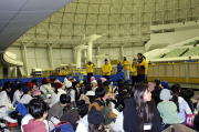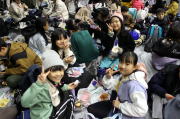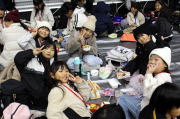 シートを広げて荷物を置き、この後の説明をしています。 |